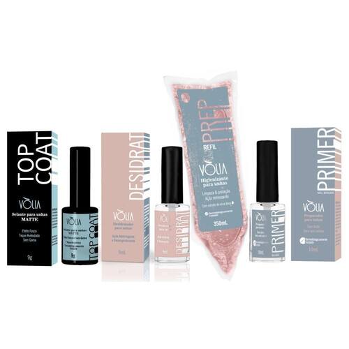 Kit para preparação e finalização de unhas em gel vlia Contém: 1un frasco de primer para unhas nail bonder 10ml com pincel 1un frasco de selante finalizador para unhas top coat matte 9g 1un frasco de desidratador para unhas com ação desengordurante 9ml 1un frasco de de higienizante para unhas sache 350ml volia Selante para unhas top coat vlia O top coat fosco vlia 9g é o finalizador sem goma com efeito fosco para unhas, que atua como um selante em gel para proporcionar maior durabilidade e resistência. Longa durabilidade Sem goma Efeito matte fosco Desidrat - desidratador para unhas vlia O desidrat vlia é um desidratador que irá remover as impurezas e a oleosidade das unhas e restaurá-las ao seu ph ideal. Sua secagem é instantânea use antes do primer vlia para melhorar ainda mais sua adesão e dos géis. Possui ação adstringente e desengordurante, promovendo adesão perfeita do primer e dos géis. Remove impurezas Remove oleosidade Restaura ao ph ideal Melhor adesão Efeito desidratador Secagem instantânea. Primer nail bonder vlia O primer nail bonder vlia 10ml retira a oleosidade das unhas deixando-as prontas para receber o alongamento. Cria goma para maior aderência do gel. Sua fórmula inovadora, sem ácido, evita a agressão das unhas naturais, tornando-se imprescindível para evitar descolamentos e infiltrações. Elimina a oleosidade superficial e equilibra o ph das unhas naturais Maior fixação para alongamentos Fórmula sem ácido Não agride as unhas ou a pele Seca sem cabine. Preparação nail higienizante para unhas sache 350ml volia O prep nail sache vlia 350ml atua como higienizante para as unhas. Contém extrato de erva doce que possui ação refrescante e . Com fragrância. Higieniza as mãos e unhas Limpeza de resíduo pós lixamento Retira goma Limpeza de utensílios Dermatologicamente testado.