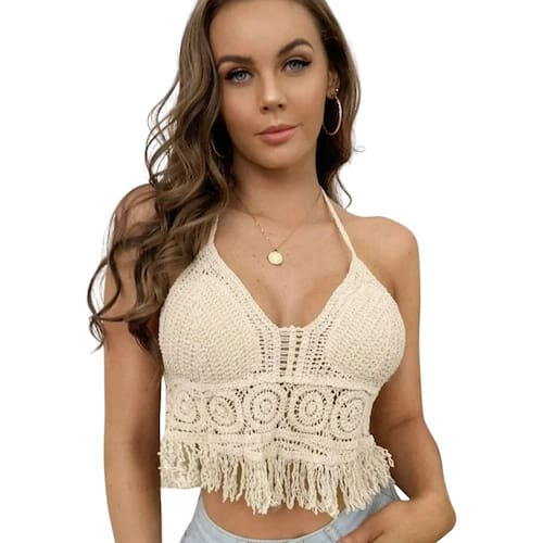 Linda Frente Única de tecido de poliéster com textura macia, superconfortável. Barra de bralette com tiras sem mangas com design de franja de crochê, copas acolchoadas, gola halter, amarração costurada nas costas, sexy e chique. Combine com jeans, leggings e shorts para um visual moderno. A blusa de biquíni Boho Cropped Crochê é perfeita para a praia às ruas e momentos felizes de verão, como férias, festas na piscina ou festas em clubes. Especificações: Cor: Branco ou BegeComprimento da camisa: top curto Estações: Primavera, Verão Material: Poliéster Tamanho Único: veste P e MOcasião: perfeito para praia, performance, festa, clube, festival de música, Halloween, cosplay e uso diário.
