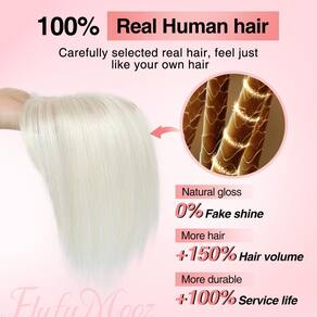 - [Topo de cabelo 100% humano]: os topos de cabelo são feitos de cabelo humano 100% real, que é brilhante, macio, fofo e não é fácil de embaraçar, com um efeito realista e natural. Além disso, o topo de cabelo pode ser enrolado com ferramentas quentes e tingido para se tornar seu gosto.