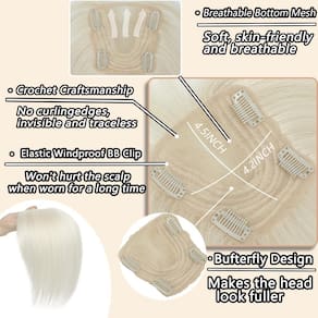 Somos uma fábrica focada na produção de topos de cabelo para mulheres. Nossos toppers de cabelo real para mulheres são feitos de 118% de cabelo humano, a sensação de toque é macia e suave, fácil de pentear e sem emaranhados. É adequado para mulheres que têm cabelos grisalhos, perda de cabelo ou queda de cabelo. Os topos de cabelo com franja são adequados para uso diário, festas, casamentos, cosplay e outras ocasiões, deixando seu cabelo mais bonito. Os topos de cabelo para mulheres são uma das maneiras mais fáceis e rápidas de mudar o estilo e a cor do seu cabelo, aumentar sua autoconfiança! Existem cores diferentes para sua opção, como top de cabelo preto natural, enfeite de cabelo grisalho para mulheres, cabelo loiro, top de cabelo marrom Remy, etc. Os topos de cabelo Wiggy são ideais para instalação: Quase qualquer pessoa pode aplicar topos de cabelo naturais para mulheres sem ajuda externa. Mesmo que você nunca tenha utilizado cabelo humano real antes, você será capaz de aplicar através de alguns passos simples em poucos minutos. Como cuidar: ao contrário do seu próprio cabelo, os topos de cabelo humano para mulheres podem ficar emaranhados sem nutrientes. Use um spray desembaraçante ou pegue um frasco de spray e coloque um pouco de condicionador nele. Se não houver condicionador, basta borrifar um pouco de água, para que o cabelo não fique muito seco e evite emaranhados. Aparência mais saudável e bonita. - Toppers de cabelo realistas para mulheres: Nosso topo de cabelo é uma base de renda feita à mão, muito fina, leve e respirável. Atualizamos o design da base de seda para atender à ergonomia, parecer mais atraente e usar confortavelmente. Estes protetores de cabelo humano cobrirão grandes áreas e se misturarão naturalmente ao seu cabelo existente - Toppers de cabelo humano premium 118%: Estes toppers de cabelo humano para mulheres são feitos de cabelo remy virgem preminum, a textura é macia, forte, suave e livre de emaranhados. Está disponível para modelagem, permanente e alisamento. Os topos de cabelo humano para cabelos finos deixarão você mais charmosa e bonita - Fácil de instalar: 4 clipes antiderrapantes disponíveis para mulheres com cabelo ralo, basta abrir e aplicar no seu cabelo, certifique-se de que os topos de cabelo com franja permaneçam bem no lugar. 22 clipes fixarão firmemente o cabelo humano real. Você pode usá-la em muitas ocasiões, como festas, shows, casamentos, festivais, uso diário, etc - Topper de cabelo real multifunções: as peças de cabelo para mulheres são uma opção perfeita e solução para queda de cabelo. Este enfeite de cabelo humano é adequado para pessoas no estágio inicial ou intermediário da perda de cabelo. Adicionará volume ao seu cabelo, cobrirá cabelos grisalhos e uma ligeira calva, modelará o rosto etc. Traga um novo estilo de cabelo moderno e transforme seu visual instantaneamente - Lembrete caloroso sobre as cores: nossos topos de cabelo para cabelos finos são todos capturados através de fotos reais. Devido a luzes e diferentes configurações de cor do monitor, pode ocorrer uma ligeira diferença de cor. Sugerimos que você observe a cor do seu cabelo ao ar livre sob luz natural ao ar livre antes de fazer uma seleção. Se você tiver algum problema ou dúvida sobre o cabelo, , resolveremos o problema em 30 horas