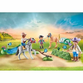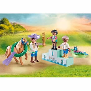 Descrição: Torneio detalhado de pôneis PLAYMOBIL com três figuras PLAYMOBIL e dois pôneis. Inclui pódio para a cerimônia de premiação, vários obstáculos e outros acessórios com temática de cavalos. Comece a competição com o seu pônei no Torneio de Pôneis da PLAYMOBIL. No terreno do torneio, com vários obstáculos, como valas de água, galhos e fardos de palha, pilotos talentosos podem mostrar suas habilidades. Percorrer o percurso perfeitamente não é tão fácil, mas todos estão dando o seu melhor. No final aguarda-se um troféu de vencedor para a criança e uma coroa de louros para o pónei. Porém, seja em primeiro ou em segundo lugar, estar presente é tudo! Características: Marca: Sunny Brinquedos Referência: 4088 Idade recomendada: A partir de 4 anos Pilhas Inclusas? Tipo de Pilha/Bateria Não necessita de pilha. Possui Luzes: Não Possui Sons: Não Dimensões aproximadas da embalagem: 14,2 x 24,6 x 7,2cm (A x L x C) Garantia: 3 meses a contar da emissão da procedência garantida Embalagem: Conteúdo da embalagem: 1 homem, 2 crianças; Animais: 2 pôneis; Acessórios: 3 barreiras, 1 pódio, 1 coroa de vitória, 1 troféu, 2 capacetes, 2 cabrestos, 1 chapéu, 2 fardos de feno Certificado Inmetro: Registro 007648/2020 Produtos de decoração não inclusos. Imagens meramente ilustrativas. As cores dos objetos podem sofrer alterações devido a luminosidade, configurações do monitor e até mesmo a percepção do usuário.