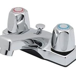 Torneira de lavatório Oakbrook com cartucho de compressão pop-up de duas alças de 4" com acabamento cromado redondo de 1,5 Gpm.