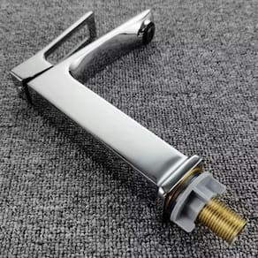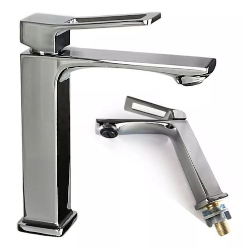 Aqui está um exemplo dos nossos produtos: a torneira monocomando para banheiro de bica alta. Com um design quadrado e cascata, é fabricada em metal e possui acabamento em cromo triplo cromado, resistente a riscos e sem descascar ou enferrujar.