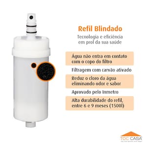 - Seu modo de filtragem é processado pelo refil blindado, que utiliza Carvão Ativado.