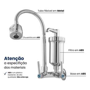 A Torneira é fabricada 100% no Brasil Fabricação própria Metais e CIA Temos todas as peças de reposição a venda Fixação: Parede ou Bancada favor escolher o modelo na ato da compra Certifique-se de que a foto do produto é o modelo correto para sua instalação. O que é ABS? ABS é um polímero termoplástico que possui excelente resistência, durabilidade e não enferruja. Produto: Torneira Com Filtro Ligação: Serve para ser instalada 1/2 Material: ABS Não Enferruja Acionamento: 1/4 de Volta Pressão Mínima Recomendada: 04 MCA Pressão Máxima Suportada: 40 MCA Temperatura Suportada: 0°C até 90°C Material Tubo: Inox Filtro e Chuveirinho Base ABS Filtro Universal, tecnologia Pró Saúde, garante uma filtragem ainda mais eficiente. Certificado pelo INMETRO. Dúvidas? Estamos à disposição para ajudá-lo(a).