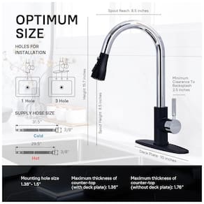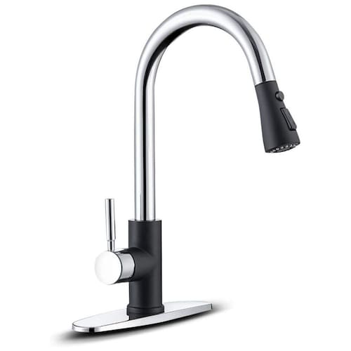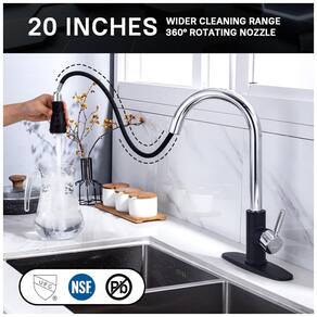 Esta torneira de pia de cozinha é feita com mangueira de PEX de alta qualidade, flexível e antirachaduras, que suporta altas temperaturas e permanece em bom funcionamento mesmo com água quente passando por ela. A torneira possui uma configuração de três modos, para alternar facilmente entre jato para encher, spray para enxaguar e pausar evitando respingos no modo multitarefa. O arejador de torneira em formato de favo de mel oferece água mais macia, sem respingos e ruídos, fornecendo água limpa e fresca. A torneira de cozinha de alça única com bico pulverizador pull down é equipada com um bico pull down ergonômico de rotação de 360 graus, proporcionando uma experiência de uso mais conveniente. A torneira de cozinha de aço inoxidável é fácil de combinar com bica de arco alto de 39 cm, tornando a limpeza muito fácil mesmo para panelas e jarras grandes. Esta torneira pode ser instalada livremente devido ao seu longo tubo de rosca, podendo ser uma torneira de cozinha de 3 furos ou torneira de cozinha de 1 furo.