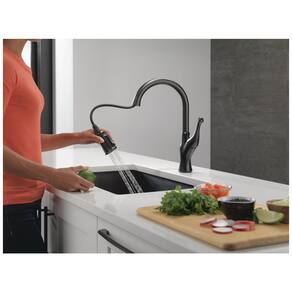 A coleção de cozinhas Ophelia apresenta um estilo tradicional com detalhes curvos. O Delta MagnaTite Docking usa um poderoso ímã integrado para colocar seu pulverizador pull down com precisão no lugar e mantê lo lá quando não estiver em uso. A tecnologia Delta ShieldSpray limpa com precisão semelhante à do laser, ao mesmo tempo que contém sujeira e respingos. Um jato concentrado elimina sujeiras teimosas, enquanto um inovador escudo de água contém respingos e limpa a sujeira, para que você possa gastar menos tempo encharcando, esfregando e trocando de camisa. As torneiras de cozinha Delta com tecnologia DIAMOND Seal funcionam como novas para o resto da vida, com um design patenteado que reduz os pontos de vazamento e é menos complicado de instalar. As torneiras para pia de cozinha com orifícios de spray TouchClean permitem que você limpe facilmente o acúmulo de cálcio e cal com o toque de um dedo. A torneira de cozinha preta é projetada para caber em configurações de pia de cozinha de furo único ou de 3 furos, com tudo o que você precisa incluído em uma caixa conveniente, incluindo linhas de fornecimento InnoFlex PEX integradas. A torneira também tem um design de arco alto e pescoço de ganso que gira 360 graus com um diâmetro de 20 pol e uma mangueira retrátil para maior comodidade durante as tarefas diárias da cozinha. A alça de alavanca é compatível com ADA.
