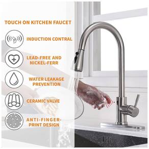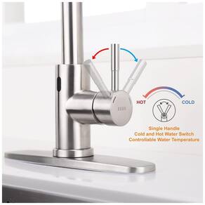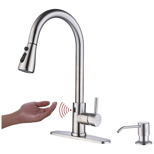 Este produto é uma torneira para pia de cozinha que oferece a conveniência de um sensor infravermelho de movimento, permitindo que você ligue e desligue a torneira sem precisar tocá la. Com uma faixa de alcance de 8 cm é uma solução higiênica para multitarefas com as mãos livres. A torneira é adequada para quase todas as pias de cozinha, incluindo pias de armário, pias drop in, pias de trailer e pias de casa de fazenda. Além disso, ela vem com uma placa de deck para 1 ou 3 furos e um dispensador de sabão.