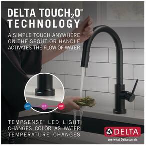 A tecnologia Delta Touch2O permite que você use sua torneira de cozinha com as mãos cheias ou sujas. Com um simples toque em qualquer lugar da bica ou alça com o pulso ou antebraço, a água começa a fluir na temperatura ajustada pela alça. A luz LED Delta TempSense muda de cor para indicar a temperatura da água e evitar surpresas desagradáveis. O Delta MagnaTite Docking usa um ímã poderoso para manter o bastão de pulverização no lugar quando não está em uso. As torneiras Delta com tecnologia DIAMOND Seal reduzem os pontos de vazamento e duram duas vezes mais que o padrão da indústria. As torneiras de cozinha com orifícios de spray TouchClean permitem que você limpe facilmente o acúmulo de cálcio e cal com o toque de um dedo. A instalação é fácil, podendo ser feita em furo único ou 3 furos, com a opção de adquirir separadamente a placa de deck RP64070BL. As linhas de abastecimento InnoFlex PEX são integradas à torneira, reduzindo um ponto de vazamento.