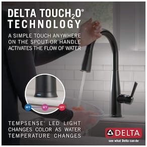 A tecnologia Delta Touch2O permite que você controle o fluxo de água da torneira de cozinha com um simples toque em qualquer lugar da bica ou alça, usando o pulso ou antebraço. A luz LED Delta TempSense muda de cor para indicar a temperatura da água e evitar surpresas desagradáveis. O Delta MagnaTite Docking usa um ímã integrado para manter o pulverizador no lugar quando não está em uso. As torneiras Delta com tecnologia DIAMOND Seal reduzem os pontos de vazamento e duram o dobro do tempo que o padrão da indústria. As torneiras de cozinha com orifícios de spray TouchClean permitem uma limpeza fácil do acúmulo de cálcio e cal. A instalação é fácil e as linhas de fornecimento InnoFlex PEX são integradas para reduzir pontos de vazamento. A torneira também possui um recurso de fluxo de água automático que desliga após quatro minutos de uso contínuo e um indicador de bateria fraca para pilhas.