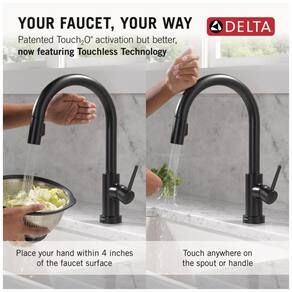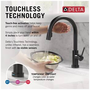 A coleção Trinsic Kitchen da Delta apresenta um design moderno e elegante, com tecnologia Touchless que ajuda a manter germes e sujeira longe da torneira da cozinha. Com três maneiras de controlar a água colocando a mão perto da torneira, batendo na superfície ou usando a alça padrão o usuário pode escolher entre o modo Touch2O com Touchless ou Touch2O apenas. A luz LED TempSense muda de cor para alertar sobre a temperatura da água e o MagnaTite Docking usa um ímã integrado para manter o bastão de pulverização no lugar quando não estiver em uso. As torneiras Diamond Seal da Delta reduzem os pontos de vazamento e duram o dobro do padrão da indústria. Com uma instalação DIY fácil e vídeos passo a passo disponíveis no YouTube da Delta Faucets, você pode instalar com confiança. A ativação Touchfree ajuda a manter a torneira limpa e o corte automático do fluxo de água após quatro minutos ajuda a economizar água.