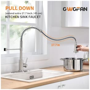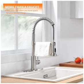 Esta torneira de cozinha de níquel escovado possui uma bica aberta com altura de 47 centímetros, o que a torna adequada para a maioria dos armários. A placa de deck de 25,4 centímetros está incluída e é possível escolher entre uma torneira de cozinha de um furo ou de três furos. O alcance do bico é de 22,9 centímetros, a altura do bico é de 12,7 centímetros e a altura total da torneira é de 47 centímetros. A espessura máxima do deck é de 6,4 centímetros e o requisito de tamanho do furo pré-perfurado é de 3,5 a 3,8 centímetros. A mangueira pode ser puxada facilmente até 43,2 centímetros para alcançar qualquer posição da pia. A torneira apresenta um modo duplo de pulverização, com fluxo arejado suave e spray poderoso sem respingos, graças aos orifícios do pulverizador de borracha dura. O pulverizador de torneiras de pia de cozinha de 360 graus permite colocar o interruptor em todas as posições desejadas. A torneira é feita de aço inoxidável SUS304 e mangueiras internas PEX de qualidade alimentar, garantindo a saúde do usuário. As válvulas de disco de cerâmica excedem os padrões de longevidade da indústria, garantindo desempenho durável para toda a vida. Além disso, a torneira apresenta um aerador de alto desempenho.