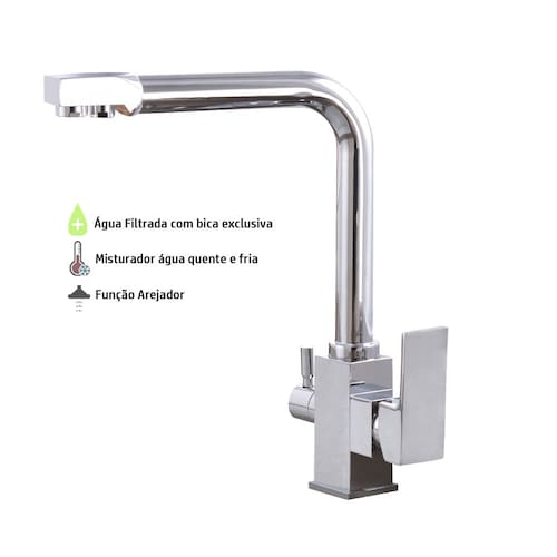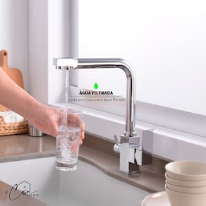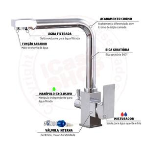 A Torneira Gourmet Ibiza foi projetada para sua cozinha, combinando seu design moderno e minimalista à inovação da bica exclusiva para água filtrada. De um lado o misturador monocomando controla a vazão e a mistura de água quente, do outro o seletor de fluxo de água filtrada. Além da praticidade de sua bica giratória, a queda d’água conta com aerador que suaviza o fluxo, evita respingos e proporciona a redução no consumo. A rotação da bica permite o posicionamento dos manípulos de abertura de acordo com o lado de sua preferência. O filtro de passagem para água filtrada é instalado dentro do balcão, mantendo o design de seu projeto e proporcionando a otimização do espaço. A Fabricação com materiais nobres e o revestimento especial em tripla camada de Cromo conferem ao produto um acabamento perfeito e durável. Praticidade, luxo e sofisticação de um produto premium em sua cozinha, agregando sustentabilidade, economia e mais saúde para sua família. A Torneira Ibiza é o detalhe que faltava em seu projeto!