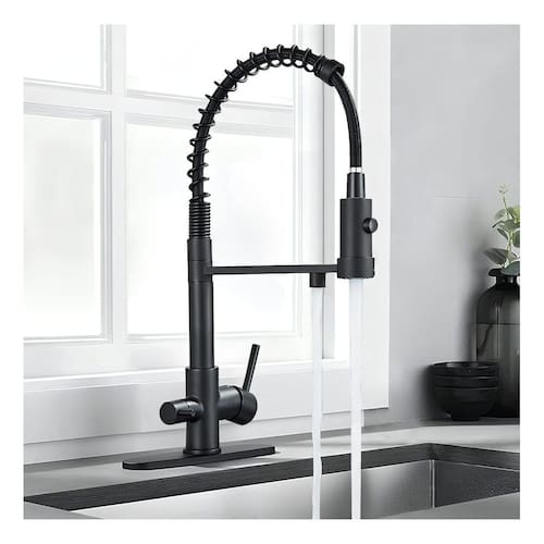 A torneira possui um acabamento preto fosco, proporcionando um visual moderno e elegante para a sua cozinha.