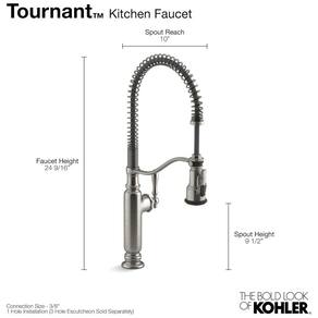 A torneira de cozinha Torneio foi projetada para atender às necessidades de chefs domésticos ambiciosos, oferecendo estilo elegante e desempenho profissional para a sua cozinha. Com um pulverizador suspenso exclusivo de três funções, é possível acelerar uma série de tarefas, incluindo preparação de alimentos, enchimento de potes e jarras e limpeza. A mola helicoidal de alto arqueamento é removida facilmente para facilitar a limpeza.