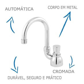 Para deixar o banheiro impecável em todos os detalhes e ainda consumir menos água, uma opção excelente é esta torneira. Com fechamento automático e design moderno, ela proporcionará economia de água e dará um toque especial ao banheiro, unindo o útil ao agradável. Com estrutura em metal, um material com características essenciais a esse tipo de peça, resistência e durabilidade, ela recebe acabamento cromado que a torna ainda mais bela. A linha automática com temporizador é fabricada de acordo com os rigorosos padrões de qualidade internacionais, e vem com fechamento automático com temporizador entre 6 e 10 segundos. Somando a isso, este modelo acompanha mecanismo economizador de água, conferindo uma economia de até 60% em relação às torneiras comuns.