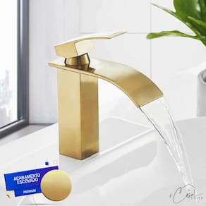 Torneira Cascata Banheiro Lavabo Monocomando Dourada Escovada 19cm Linha Premium iCas@ Shop – Requinte e Sofisticação.