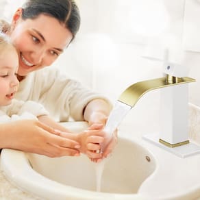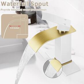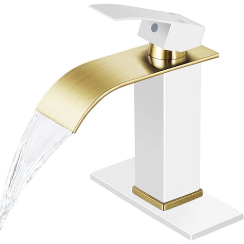 Qomolangma Torneira de banheiro em cascata, torneiras modernas de banheiro de alça única branca e dourada escovada para banheiro de 1 ou 3 furos torneira misturadora torneira de lavatório com - [Design de cascata] - Design simplificado de bico de cachoeira, fluxo confortável para dar a você uma melhor experiência de usuário. Aparência contemporânea aplica-se a torneiras de pia de barra de uma manípula, como torneiras de banheiro e torneiras de pias de vaidade para trailers. - [Material premium] - Toque moderno na torneira do banheiro com preto fosco, a torneira da pia do banheiro resiste a manchas e descascamentos causados pela corrosão. - [Temperatura ajustável] - A torneira da pia do banheiro adota alças de alavanca única, quente e frio são opcionais, o que pode ajudar os usuários a se ajustarem facilmente ao fluxo de água e temperatura apropriados. É a melhor escolha para o seu banheiro. - [Acessórios incluídos] - Dreno pop-up não incluído, placa de deck de 15 cm incluída para instalação de pia central de 1 ou 3 furos de 10 cm. 2 mangueiras flexíveis (quentes e frias). - [Fácil de usar] - É muito fácil de instalar e a superfície lisa facilita a limpeza. O recurso anti-impressão digital também garante que ele sempre o mantenha limpo e arrumado.