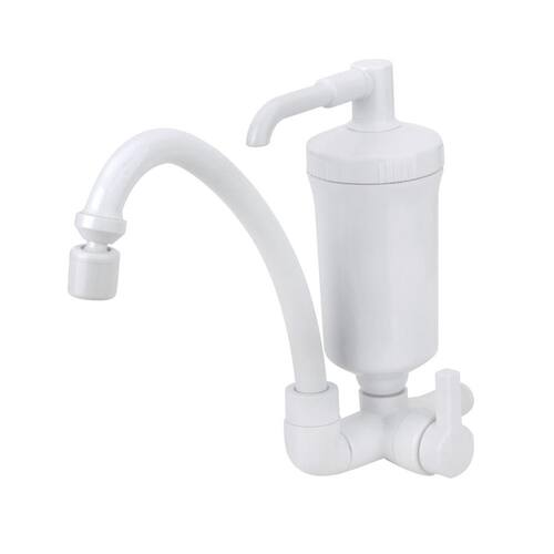 Torneira De Parede Com Filtro De Água possui um elemento filtrante rosqueável de carvão ativado, que reduz o cloro presente na água bem como o cheiro e gosto ruim que ele provoca quando em excesso. Tripla filtração com carvão ativado. Registro com sistema 1/4 de volta com pastilha cerâmica. Arejador articulável. Vazão 20l/h. Retenção de partículas: Classe D. Pressão de Operação: 19,6kPa mín./392kPa máx. Com Redução de Cloro Livre =75% . 1 Ano de Filtros com carvão ativado atóxico e naturais para filtração completa, Registro único para escolha entre água normal e filtrada 1/4 de volta , Elimina gostos e odores desagradáveis presentes na água, Melhor custo/benefício em relação a água mineral, Sistema fácil de instalar e simples de usar, Retém sujeiras presentes na água, Reduz os índices de cloro presente na água, Difusor móvel para direcionamento da água. Pressão de operação: 19,6 kPa mín./ 392 kPa máx. 2 mca / 40 mca Dimensionais: A: 240 mm- B: 260 mm Composição copo e tampa: ABS Grau de Filtração: 15 micra Vazão: 20 l/h Peso bruto: 0,108 kg Peso líquido: 0,160 kg Black: 7896811106795 Dimensionais Emb. AxLxP: 280 mm x 240 mm x 100 mm Ean: 7896811106283