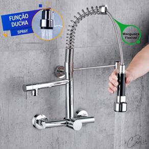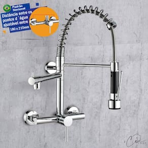 - Marca: iCasa Shop - Modelo: Spring Twin - Referência : IC-901-5C - Aplicação: Parede - Distância entre os pontos d’água – Regulável de 180 a 210mm - Misturador : Monocomando - Material: Corpo e Ducha em Liga Metálica de Cobre e Zinco - Mola: Em aço inox - Mangueira: Em trama de aço inox flexível - Acabamento: Cromo tripla camada - Altura Total: 55 centímetros - Temperatura de trabalho: 5ºC - 70ºC - Pressão ideal de funcionamento: 5mca - 30 mca - Itens Inclusos: Adaptador excêntrico roscado (2x), flange de fixação, buchas e parafusos de fixação - Instalação: Manual de instalação incluso no produto - Peso total (produto + embalagem): 2,8 Kg - Garantia: 12 meses contra defeitos de fabricação