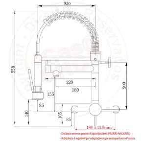 INSTALAÇÃO Os acessórios para instalação e fixação acompanham o produto. Distância entre os pontos d’água Ajustável de 180 a 210mm (Padrão nacional). A distância é regulável por adaptadores que acompanham o Produto. O suporte superior de fixação pode ser dispensado somente pontos de instalação com tubulações rígidas em que a fixação apenas dos dois pontos d´água fixe adequadamente a torneira. Recomendamos a instalação do suporte.