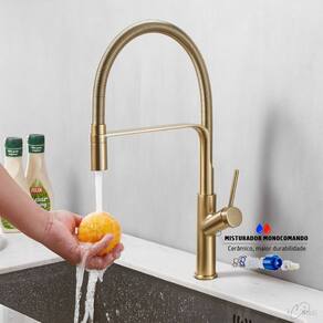 ESPECIFICAÇÕES TÉCNICAS - Marca: iCasa Shop - Modelo: Dubai - Referência : IC-969BG - Misturador Monocomando "Quente e frio" - Aplicação: Bancada / Mesa - Material: Totalmente fabricada em Liga Metálica de Cobre e Zinco - Mangueira Flexível: Aço Inox 304 Revestido - Mola: Aço Inox - Acabamento: Dourado Escovado em tripla camada com selador (Evita marcas d’água e manchas) - Válvula interna: Cartucho cerâmico de altíssima durabilidade - Altura Total: 50 centímetros - Temperatura de trabalho: 5ºC - 70ºC - Pressão ideal de funcionamento: 5mca - 30 mca - Furação de instalação: 35mm (milímetros) - Itens Inclusos: 2 mangueiras flexíveis para ligação da torneira água quente e fria - Instalação: Manual de instalação incluso no produto - Peso total (produto + embalagem): 2,4 Kg - Garantia: 12 meses contra defeitos de fabricação