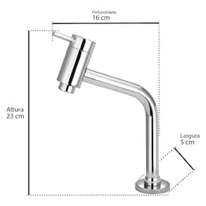 INSTALAÇÃO: Fácil, para bancadas de banheiro e lavabo. Uso exclusivo água fria. Acabamento: Cromado Acompanha Arejador: Sim Altura: 23 cm Altura Bica: Baixa Altura da Base até a Curvatura do Tubo: 5 cm Altura da Base até a Ponta do Arejador: 23 cm Altura Total: 23 cm Ambiente Principal: Banheiro Bitola: 1/2 Cor: Cromado Cor do Produto: Cromado Cor Predominante: Cinza Diâmetro: 8 cm Indicado para Cuba: Apoio Informações Complementares: elegância, durabilidade, funcionalidade, praticidade, alto brilho, acabamento premium, design compacto, fácil limpeza, resistente, confiável, uso diário, qualidade nacional Itens Inclusos: 1 Torneira Largura: 5 cm Linha ou Coleção: Domum Manual de Especificação Técnica: https://product-hub-prd.madeiramadeira.com.br/452338770/documents/7a7f9a9d-ce61-4d3d-9568-1c91f3042c753398130685117714395093407.pdf Manual de Montagem e Instalação: https://product-hub-prd.madeiramadeira.com.br/452338770/documents/fbb5f9dd-4e36-497f-ad6b-4279edaaf8e33398129685117714395077276.pdf Marca: WAY Material Principal: Metal Mecanismo de Vedação: Convencional Origem do Produto: Importado Peso: 0,500 kg Pressão Máxima: 16 mca Pressão mínima: 2 mca Profundidade: 16 cm Recomendações de Uso, Manutenção e Limpeza: Furo na bancada: padrão DN15 (1/2 polegada) Montagem: posicione a torneira com a canopla espelhada Fixação: aperte a arruela e o apoio por baixo da bancada Conexão: rosqueie a entrada de água fria (1/2") Vedação: use fita veda-rosca para evitar vazamentos Tipo de Acionamento: Alavanca Tipo de Bica: Fixa Tipo de Instalação da Torneira: De Mesa Tipo do Arejador: Fixo Torneira Indicada para: Água Fria Vazão máxima: 16 L/min Vazão mínima: 2 L/min