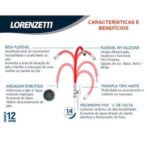 Torneira de Mesa Bica Flexível Lorenzetti Lorenflex White 1177 R27 Cada vez mais, consumidores procuram ter em suas casas produtos com características inovadoras, tanto na utilização como no design. Uma forma de diferenciar, é utilizar materiais ou cores que se destaquem no ambiente. Outra maneira é incluir aplicações que tragam ainda mais praticidade no uso. Pensando nisso, a Lorenzetti lança a torneira LorenFlex Sua bica flexível revestida de silicone, permite que seja posicionada em qualquer direção, ampliando Sua área de atuação. Material: Corpo em metal, flexível revestido de silicone: funcional, resistente e fácil de limpar. Acabamento: Vermelho com Cromado. Filtro: Opcional. Arejador: Economia de água e conforto, pois evita respingos. Bica: Flexível, Amplitude total de movimento Versatilidade e praticidade no uso. Aumenta a área de atuação do jato e facilita a colocação de uma vasilha ou panela na pia. Linha: LorenFlex Modelo: 1177 R27 Garantia: 12 Anos