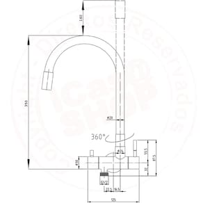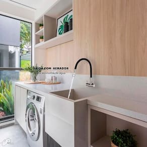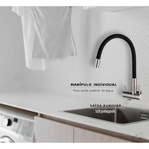 Possui saída auxiliar para máquina de lavar ou purificador, com manípulo exclusivo. De um lado a válvula de 1/4 de volta libera o fluxo da saída auxiliar, do outro lado controla com precisão a vazão de água da torneira.