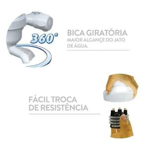 Bica baixa giratória. Dispensa o uso de ferramentas para manuseios e reparos. Fácil reposições e troca da resistência. Registro possui ativação de de volta. Comodidade de uso. Mais conforto em dias de frio e podendo ter economia nos dias quentes. Com 3 níveis de temperatura. Material:Termoplásticos, elastômeros, ligas de: Prata, cobre, alumínio, cromo e níquel.