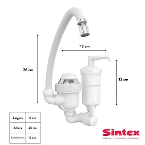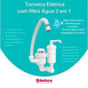 Torneira elétrica de bancada com filtro água 3t 220v 4400w tfb244 - sintex - A torneira elétrica de bancada com filtro água 2 em 1 sintex é a opção ideal para quem busca um produto de qualidade e eficiência. Com design moderno e compacto, a torneira é ideal para instalação em bancadas. A bica alta giratória permite um maior alcance e direcionamento do jato de água, enquanto o arejador integrado reduz o consumo de água em até 35%. O filtro de alta performance possui carvão ativado e remove impurezas e sedimentos da água como cloro, odores, proporcionando água limpa e saudável para consumo e para as atividades domésticas. Beneficíos: Design moderno e compacto Bica alta giratória Arejador integrado Filtro de alta performance Fácil instalação e uso Resistência de troca rápida de 1 ano Detalhes técnicos: Voltagem: 220v Potência: 4400w Disjuntor: 20a Vazão l/min: 3,9 Fiação do produto: 2,5mm Pressão de funcionamento mínimo: 20 k pa 2 metros por coluna d'água Pressão de funcionamento máximo: 400 k pa 40 metros por coluna d'água Características gerais do produto: Bica: alta Cor: branco : 1 ano junto ao fabricante Material: plástico de engenharia Acompanha o produto: 1 torneira elétrica com filtro 1 1 manual de instruções : 1 ano de direto com o fabricante