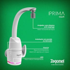 Características Gerais do Produto: • Tensão: 220V • Cores Disponíveis: Branco; Preto • Garantia: 1 Ano • Marca: Zagonel • Proteção: IP 24 • Cor: Branco; Preto • Disjuntor: 32A • Modelo: Parede ou Bancada • Pressão de Funcionamento: 20 a 400Kpa (2 a 4 M.C.A) • Eficiência Energética: D