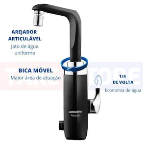 Torneira Eletrônica para Cozinha de Mesa Essence LorenzettiA Torneira indispensável no dia a dia, principalmente nos dias frios. Prática de usar e econômica, reduz substancialmente o uso de água e detergente para eliminar a gordura e lavar a louça, tornando a tarefa muito mais fácil e rápida.- Resistência Loren Ultra que garante alta performance e longa duração- Possui a melhor relação custo x benefício do mercado- Eletrônica, permite a escolha gradual da temperatura- Registro de volta e troca de resistência de fácil acesso- Possui bica alta e móvel, que facilita sua utilização no dia-a-dia- Compatível com dispositivo de proteção DR- Resistência tipo refil, fácil substituiçãoDescrição Técnica:Marca: LorenzettiCor: Preto / cromadoVoltagem: 127vPotência: 4600wSistema de aterramento: Sim