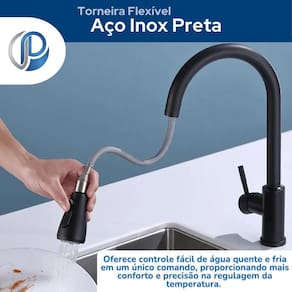 Torneira Extensível Monocomando Mesa Aço Inox Preta Cor: Preto A Torneira Misturador Cozinha Gourmet Monocomando Extensível traz praticidade e design sofisticado. Com seu acionamento monocomando, você tem a opção da água quente e fria para lavar louças e as mãos a qualquer momento, na temperatura que achar mais confortável, além de ocupar menos espaço em sua bancada.