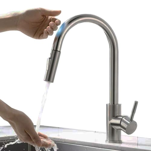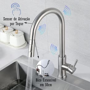 A Torneira para Cozinha Prata com Bico de Puxar e Sensor de Toque: Esta torneira combina estilo, tecnologia e funcionalidade para sua cozinha. Seu acabamento prata confere uma elegância moderna, enquanto o bico de puxar oferece versatilidade para diversas tarefas, como encher panelas e lavar alimentos. Com o sensor de ativação por toque, você pode ligar e desligar a água com um simples toque, proporcionando conveniência e higiene no manuseio. Além de prática, é uma peça de destaque que complementa vários estilos de decoração, tornando-a perfeita para cozinhas modernas e dinâmicas.