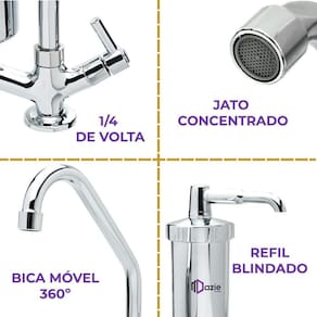 Torneira Filtro Gourmet Bancada Bica Móvel Alta Cozinha MesaSem dúvida, a cozinha é um dos locais mais utilizados e movimentados da casa, portanto, é muito importante escolher a torneira que se adapte às necessidades de uso. As torneiras da Dazie Metais são preparadas e montadas no Brasil prezando a qualidade e a satisfação de nossos clientes.Qualidade, sofisticação, resistência, tudo isso em um único produto.Sua cor cromada, que confere estilo e discrição, e ainda, combina facilmente com a decoração e outros acessórios do ambiente.Arejador que garante economia de água e jato concentrado facilitando nas atividades diárias.Possui filtro com vela de carvão ativado, um dos métodos mais eficazes para tratar a água, proporcionando uma água de qualidade, tudo que você precisa para sua casa e saúde.Além de ser um produto de fácil instalação.Especificações Técnicas:Produto: Torneira Filtro Gourmet Bancada Bica Móvel Alta Cozinha MesaRefil Incluso: 01 Refil Blindado Pró Saúde - Já Instalado;Fixação: Mesa / Bancada;Material: Liga de Cobre, ABS;Acionamento: 1/4 de Volta;Ligação: 1/2 Pressão Mínima Para Uso: 03 MCA;Pressão Máxima Suportada: 30 MCA;Temperatura Suportada: 1C até 80C;Garantia: 12 Meses;Fabricante: Dazie Metais;GARANTIA:12 meses de garantia, não aplica-se para peças que tem desgaste de acordo com a frequência de uso, citamos volantes de acionamento, mecanismo cerâmico e tubo flexível. Estes possuem garantia legal de 90 dias. Marca: Dazie Metais