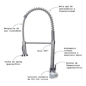 O sistema monocomando permite que a mudança de temperatura da água, de quente para fria ou vice-versa, seja feita no mesmo local de acionamento, de forma prática e economizando espaço na bancada. Abertura com mecanismo 1/4 de volta, que diminui o desgaste do reparo, aumentando a durabilidade. Bica alta giratória com movimento de 360° que permite direcionar o jato d´água para várias direções. Ducha flexível e de fácil encaixe com suporte em mola para melhor sustentação e segurança. Dispõe de duas opções de jatos: spray ou concentrado.