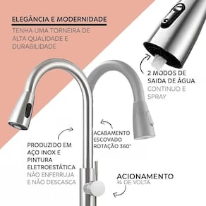 Torneira gourmet elegante e de excelente qualidade. Acabamento perfeito, oferece praticidade no dia a dia. Com misturador monocomando de água quente e fria, proporciona a temperatura ideal.