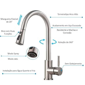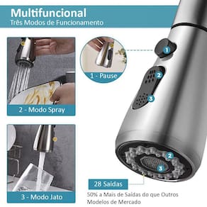 - Possui também uma alça única com configurações de 2 modos (stream / spray), fluxo para encher água, spray para enxágue,que pode atender ao seu uso diário e conveniente para todos os tipos de trabalhos de cozinha.