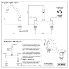 DADOS TÉCNICOS: - Garantia Fabricante: 5 anos - Posição de Instalação: Mesa - Bitola: 1/2 - Distância do furo para instalação: 20 cm - Pressão Mín.: 2 m.C.A - Pressão Máx.: 40 m.C.A - Vazão Mín.: 4 l/m - Vazão Máx.: 16 l/m - Temperatura Máx.: 70 C - Mecanismo: cerâmico 1/4 de volta - Composição: Corpo - Metal / Volante - Metal / Tubo - Metal / Canopla - ABS - Ciclo de abertura: 2 estágio - Tubo: Bica Móvel 360 com arejador móvel Marca: Shophidraulica