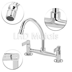 Torneira Misturador Cozinha Mesa Arejador Articulado 1/4v. Torneira Misturador Cozinha Mesa Arejador Articulado 1/4v. Este misturador duplo comando oferece para a sua cozinha beleza e requinte, fabricado em metal cromado de alto padrão de qualidade, apresenta maior durabilidade e resistência aos processos de corrosão e oxidação, manifestações comuns em locais com umidade. Trazendo modernidade e elegância para o ambiente. Com 2 comandos independentes, possibilita controlar a vazão, misturando água quente e fria com conforto e facilidade, conta ainda com bica móvel e arejador articulado otimizando muito o seu uso. Um produto inovador de alta qualidade. Mecanismo de vedação cerâmico. 1/4 de volta. Rapidez no acionamento e fechamento, proporcionando economia de água. Além disso, permite a utilização de cuba dupla. Temperatura máxima de 70 c. Material - Metal Tipo de Bica - Bica móvel com arejador articulado. Mecanismo de Vedação Cerâmica Compatível com sistema de aquecimento - Sim Composição - Latão Altura Bica - Alta Pressão Máxima - 40 m Pressão mínima - 2 m Recomendações de Uso, Manutenção e Limpeza Limpar apenas com pano macio e sabão neutro. Não usar produtos abrasivos como sapólio, palha de aço e produtos químicos. Marca: Lhd Metais