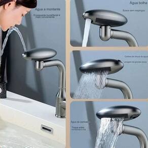 A torneira possui rotaçao 360 graus, ângulos ajustáveis e flexíveis. E a torneira possui 4 modos de jatos de agua (cascata, modo chuva, modo bolha e ducha), para trocar os modo basta girar a torneira.