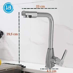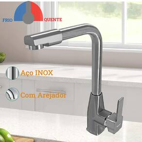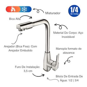 - Altura Total do Produto: 29,5 cm - Largura: 4,5 cm - Profundidade: 23 cm - Bitola De Entrada De Água: 1/2 | 3/4 - Mecanismo | registro: ¼ de volta - Tipo Da Torneira: Monocomando com Misturador (Quente e Frio) - Peso: 1,13 kg - Material Do Corpo: Aço Inoxidável - Pressão Mínima Para Funcionamento: MCA 10 - Pressão Máxima Para Funcionamento: MCA 40 - Vazão Mínima Para Funcionamento (L/min): 4 - Vazão Máxima Para Funcionamento (L/min): 15 - Arejador (Bica Fixa): Com Arejador Embutido - Furo De Instalação: 3,5 cm - Acabamento: Aço Inoxidável