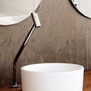 Uma torneira para banheiro pensada para cuba de apoio, a fim de evitar respingos ao lavar as mãos. Se preferir, fuja do normal, instale sua torneira nos cantos da cuba ou até mesmo na lateral.