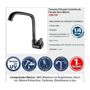 - Marca: Lorenzetti - Modelo: 7111084 (1168 F61) - Material de fabricação: ABS (Plástico de Engenharia); - Cor: Preto - Bitola móvel: Giro de 360 - Bitola: 1/2' (DN15) - Proteção: Acabamento com proteção UV e tratamento anticorrosivo) - Mecanismo: Cerâmico 1/4 de volta - Pressão mínima de funcionamento: 1,5 mca - Pressão máxima de funcionamento: 40 mca - Temperatura máxima de funcionamento: 50C - Arejador embutido: Economiza água e evita respingos - Garantia: 12 meses