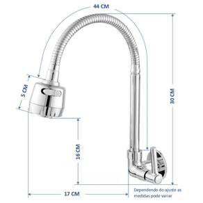 Principais características: - Torneira de cozinha modelo parede com tubo gourmet flexível - Duas opções de jato: contínuo e chuveirinho - Acionamento 1/4 de volta: maior praticidade e economia - Acabamento/acionamento do tipo alavanca em metal cromado - Altura de 32 cm pode variar de acordo com ajuste - Instalação na parede - Bitola de 1/2 acompanha bucha de redução 3/4 - Pressão mínima: 3 MCA Metros de Coluna D'Água - Pressão máxima: 40 MCA Metros de Coluna D'Água