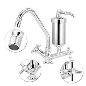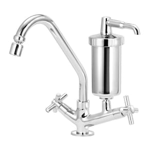Torneira com filtro para cozinha, ideal para eliminar cloro, odores, sabores e moléculas orgânicas através do elemento filtrante de carvão ativado. Bica móvel com arejador articulado facilitando o uso e trazendo praticidade.