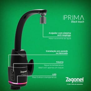 Torneira Prima Eletrônica Preto de Parede 5500 Watts 110 Volts - Tpmel55127bl03 - Zagonel Torneira Prima Eletrômica Preto 5500 Watts 110 Volts - Tpmel55127bl03 - Zagonel Torneira Prima Eletrônica Preto de Parede 5500 Watts 110 Volts - TPMEL55127BL03 - ZAGONEL Descrição: Primeira torneira com tecnologia TOUCH do mercado nacional, a torneira Prima Black Touch foi pensada para ser conceito de conforto e funcionalidade desde sua instalação. Traz em seu design linhas elegantes e modernas, com bica giratória, além da possibilidade de instalação em bancada ou parede.