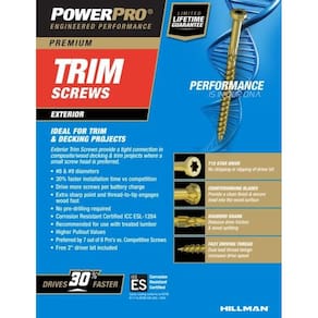 Tornillos Power Pro 48632 para molduras, #8 x 2.5", para madera, terrazas, compuestos y molduras exteriores, resistencia a la corrosión, color bronce, caja de 1 libra con 131 piezas. - Diseñados para uso exterior: ideales para terrazas y cualquier proyecto de madera al aire libre. - Mejor resistencia a la corrosión de su clase: recubrimiento cerámico bronce supera las 1,000 horas en prueba de niebla salina según ASTM B124. - Punta auto-iniciadora: permite un atornillado 20% más rápido en madera. El diseño de rosca gruesa y punta autorroscante elimina la necesidad de perforar el agujero previo. - Sin astillado: reduce un 75% las fracturas en madera comparado con tornillos estándar. - Cuchillas para avellanado: aseguran un agarre más firme sobre la superficie de la madera. Recomendados para maderas tratadas. - Diseño de estrella (Torx): con 6 puntos de contacto que reducen el deslizamiento y el camout durante el apriete. - Especificaciones: 131 piezas, tornillos para madera #8 x 2.5”, incluye punta T10 para estrella/Torx. Presentación cómoda y práctica para mantener el orden. - Punta T10: incluye punta T10 para facilitar la instalación y evitar errores. - Garantía limitada: respaldada por el excelente servicio al cliente de Hillman, con garantía limitada contra óxido y corrosión.