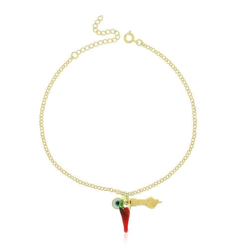 Tornozeleira Pingente de Pimenta Olho grego e Figa Banho de Ouro Tamanho da Tornozeleira: 24cm Figa 2cm x 07mm Olho Grego 0,6mm x 0,6mm Pimentinha 2cm x 0,5mm Peso Total : 3.9g - Acompanha embalagem para presentear conforme imagem - Acompanha certificado de -temos uma equipe preparada para te auxiliar no pós venda Jhulias Joias e Semi Joias Joias de Qualidade Marca: Não Informado Ean: 7793833683863
